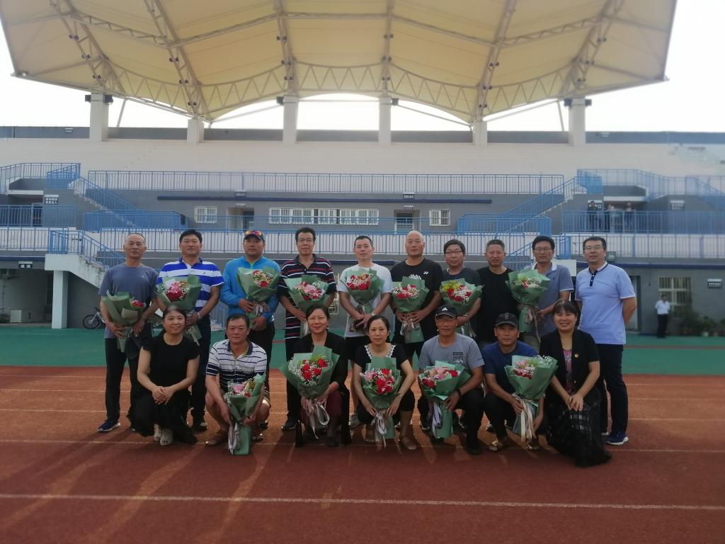 会后公司工会为从教30年以上的教师们发放了慰问礼品,领导班子成员在运动场上和老师们合影留念。