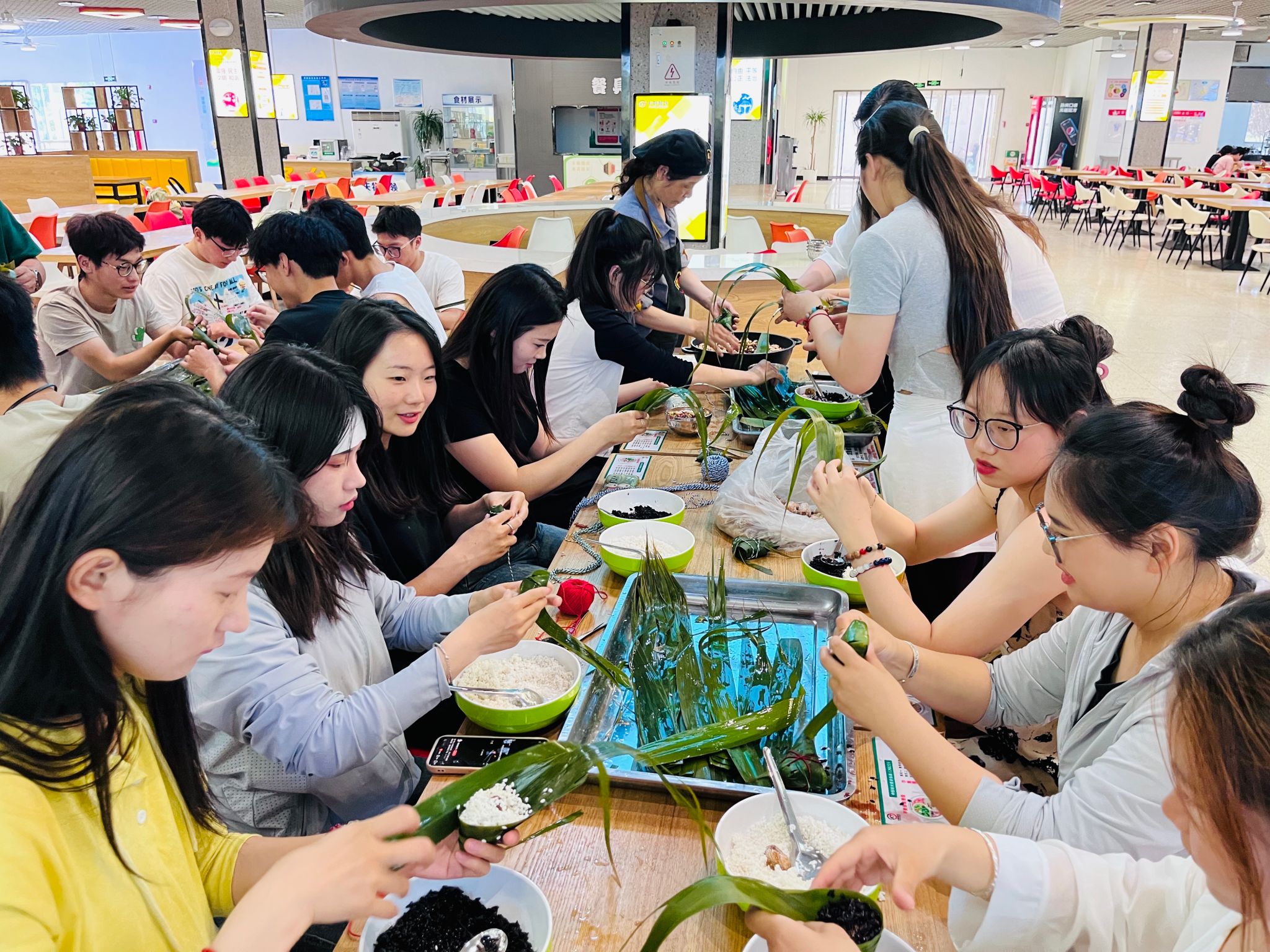 刚开始,大家包出来的粽子奇形怪状,有三角粽、四角粽、牛角粽、漏馅粽、四不像粽,但在老师和食堂工作人员的帮助下,同学们很快就掌握了包粽子的方法,卷粽叶、填蜜枣、包粽米、系粽绳......每个环节都做得有模有样,活动现场欢声笑语不断,大家一边包粽子一边交流端午节传统习俗,体验着包粽子的乐趣。