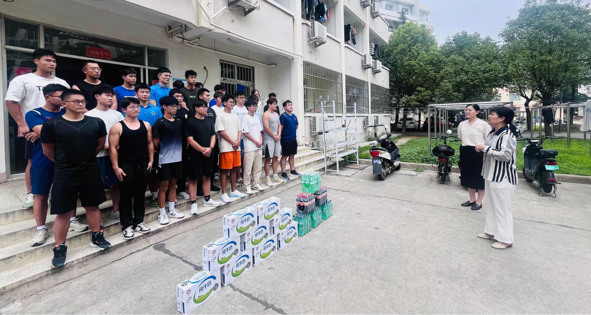 在B10宿舍楼下,公司领导与同学们进行面对面交流,了解同学们在学习和生活上的困难。张萍勉励大家要克服天气热等困难,不忘留校初衷,对员工提出四点要求:一是努力学习,坚定信心备战考研,同时注意劳逸结合,提高学习效率;二是希望留校员工明确目标,珍惜时间,在暑期训练和社会实践中有所收获,为备战竞赛打下坚实基础;三是留校期间有任何问题要及时和公司沟通,公司和老师是同学们的坚强后盾;四是要遵守公司各项规定,提高安全防范意识与自我保护能力,确保留校期间安全。李淑华也就安全问题对员工进行了温馨提醒。