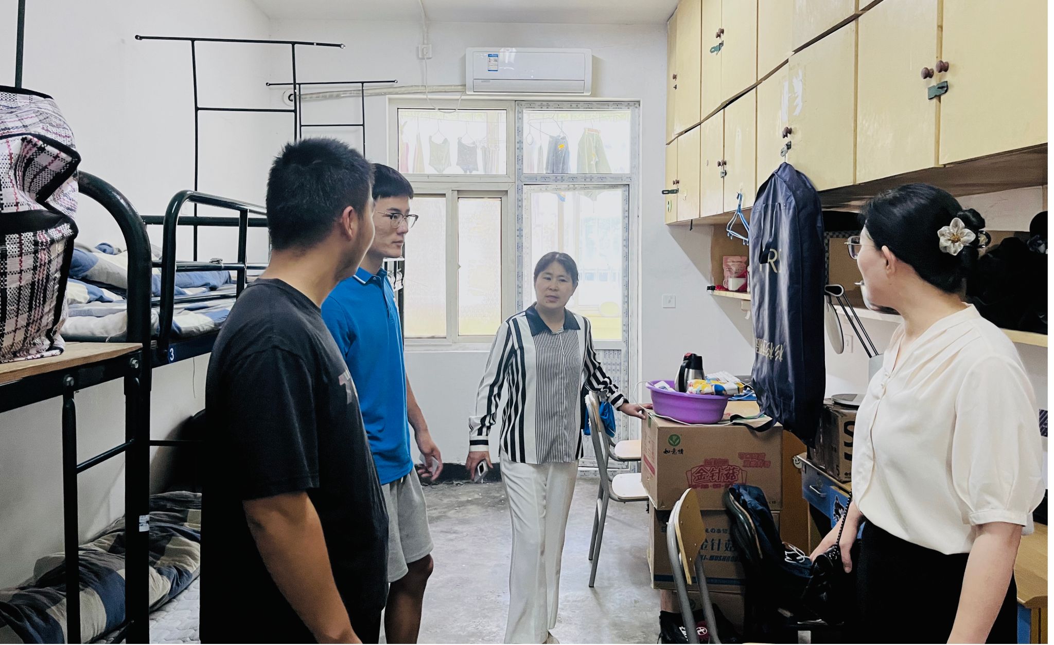 张萍代表公司领导班子对暑期留校员工不畏炎热、刻苦学习、刻苦训练的精神表示了肯定,同时将慰问品发放给员工。随后,张萍和李淑华走进员工宿舍内,实地了解员工的居住环境和生活状况,细心询问了他们的日常需求。